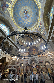 Мраморный иконостас и паникадило под куполом подчёркивают масштаб и святость пространства.