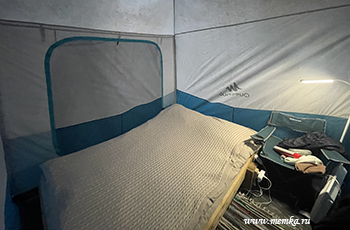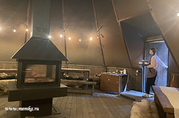 В общем, мы сняли номер в домике на 8 семей. Он близко к ресепшену и чуму, где кормят. Номер небольшой, очень чистый: кровать, кресло, холодильник, фен, что, чайник. Шкафа нет, сейфа нет. Интернет отличный, вода горячая всегда. Телевизор был, но мы его не смотрели. 2 окна, оба выходят на лес. Одно горизонтальное, размером как раз с телевизор, мы шутили, что будем его смотреть, потому что это красиво. Стоимость - 26 000 руб. за 5 ночей. Еда не входит в стоимость.