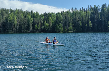 Далее мы изучили прогноз погоды, и пока выдался солнечный денег, забронировали прогулку на сапах по озеру Белому. Стоимость 5500 руб. с человека. Вас забирают, привозят на озеро, ставят на сап, катаются рядом, поят чаем и плюшками. Катаетесь 1,5 часа где-то (это много). Озеро очень красивое и практически безлюдно. Место очень красивое! Полное слияние с природой. Можно брать два отдельных сапа или один побольше. Мы брали один побольше.